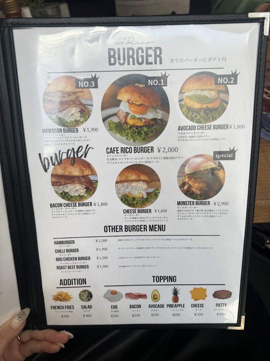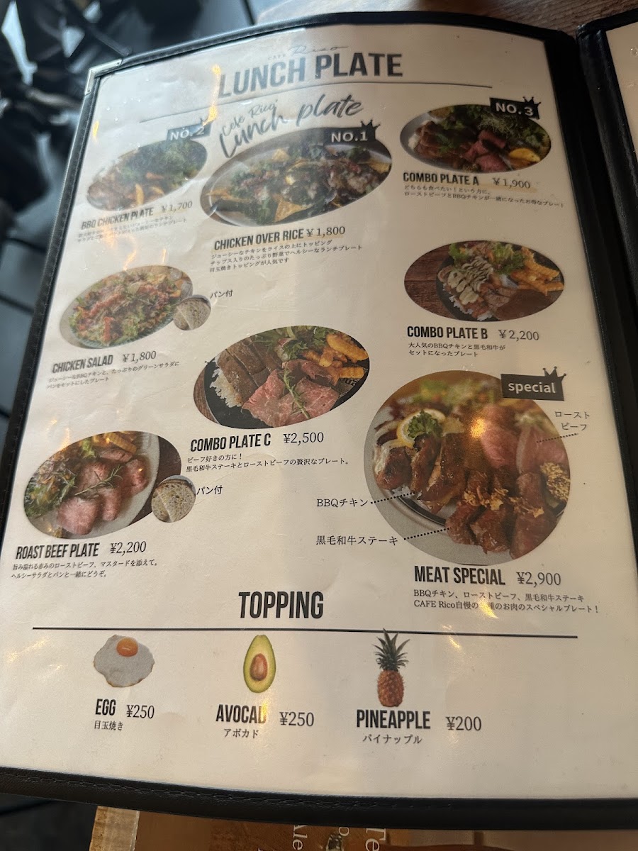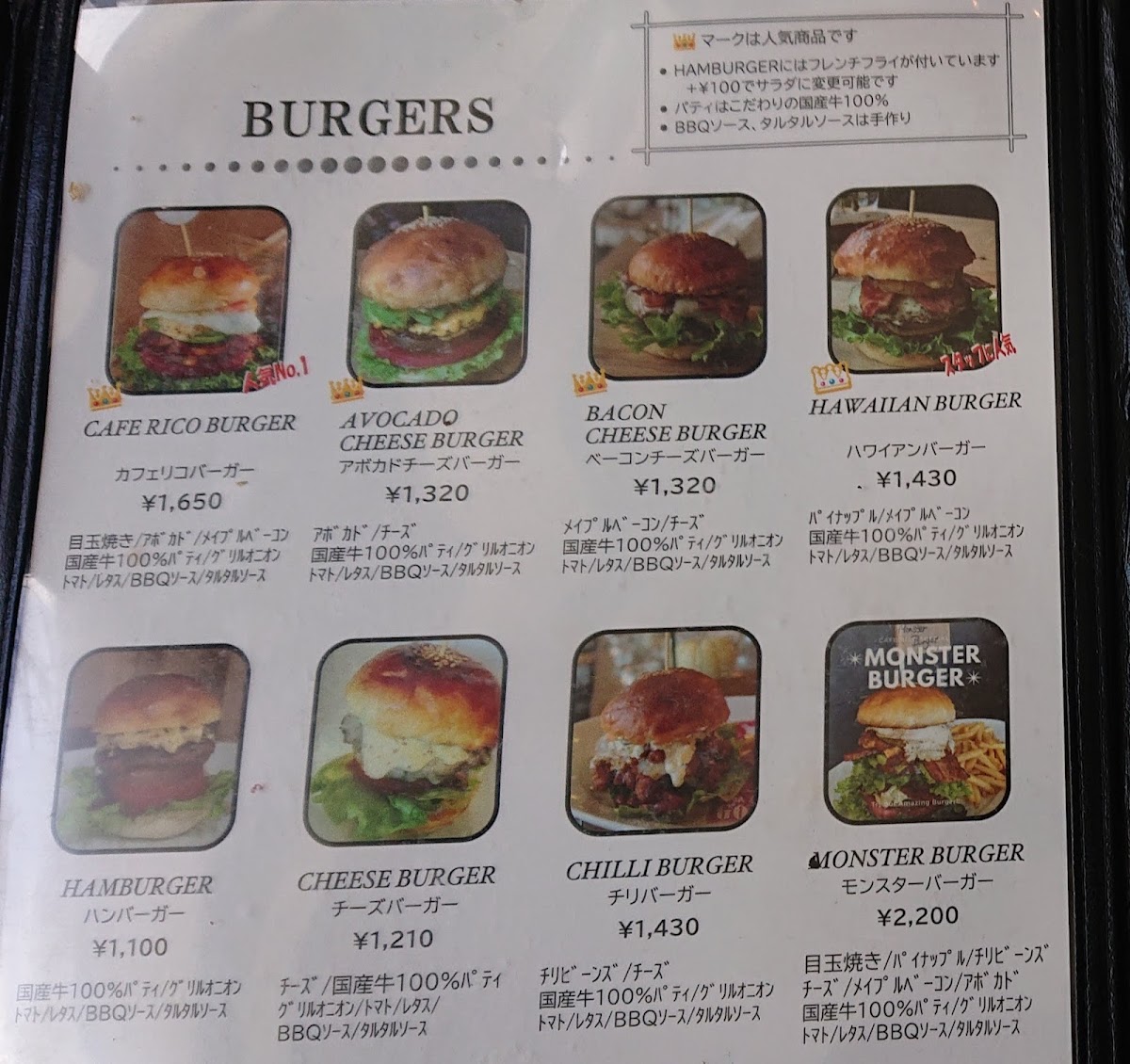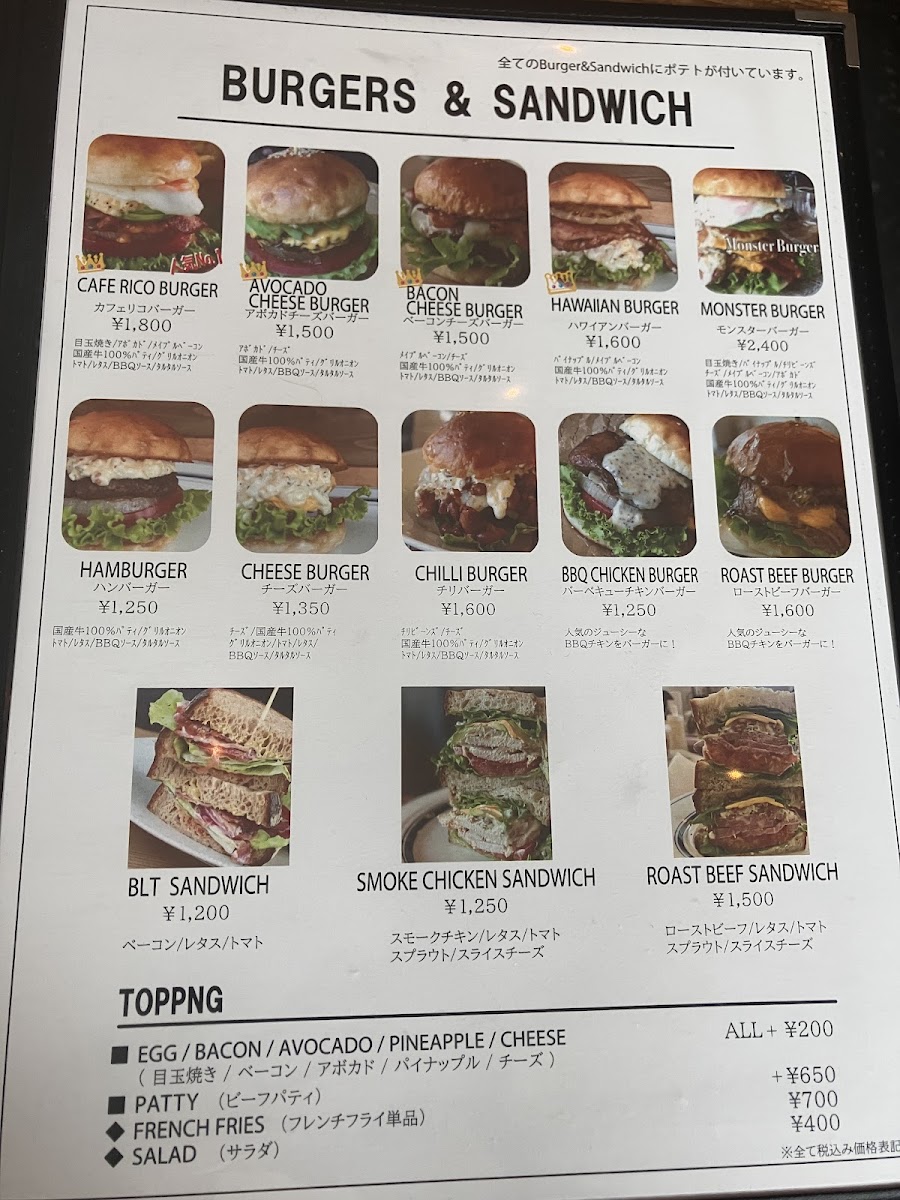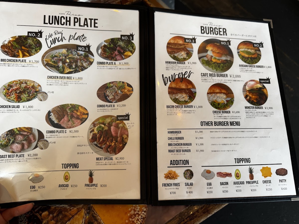The menu at Café Rico offers a delightful variety of dishes, catering to diverse tastes and preferences. For lunch, there are several enticing options such as Chicken over Rice, BBQ Chicken Plate, and a range of combo plates like Combo Plate A, Combo Plate B, and Combo Plate C, each providing a satisfying meal. Burger lovers will be thrilled with choices like the Cafe Rico Burger, Avocado Cheese Burger, Hawaiian Burger, and Bacon Cheese Burger, along with other specialty burgers like Hamburger, Chilli Burger, and BBQ Chicken Burger. The taco menu stands out with selections like Tacos Plate, 3種のタコス, Taco Rice & Egg, and the refreshing Crispy Taco Salad. For a lighter bite, the BLT Sandwich and Smoke Chicken Sandwich are perfect options. Complementing the savory offerings are a wide range of beverages, including coffee varieties like Soy Latte, Cafe Latte, and Macadamia Nuts Latte, along with an assortment of teas like Earl Grey, Nilgiri, and Kyoho Grape. There are also soft drinks such as Coca-Cola, Lemonade, and juices like Orange, Apple, and Mango. For those in the mood for something alcoholic, the restaurant serves Beer options like Budweiser, Heineken, and Corona. The BBQ Chicken & Roast Beef Party Plate is a standout for group gatherings, offering a generous selection of meats. Overall, Café Rico’s menu promises a delightful dining experience with something for everyone.